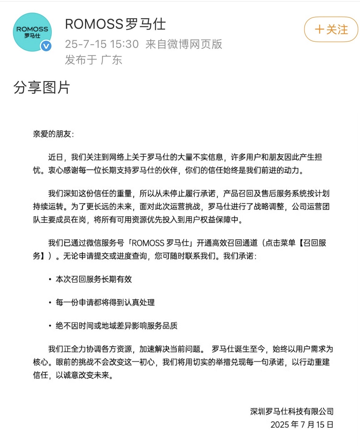 2025-11-09 11:007月15日,罗马仕官方在微博发布最新声明,称关注到网络上关于罗马仕的大量不实信息,许多用户和朋友因此产生担忧,并表示产品召回及售后服务系统按计划持续运转。“面对此次运营挑战,罗马仕进行了战略调整,公司